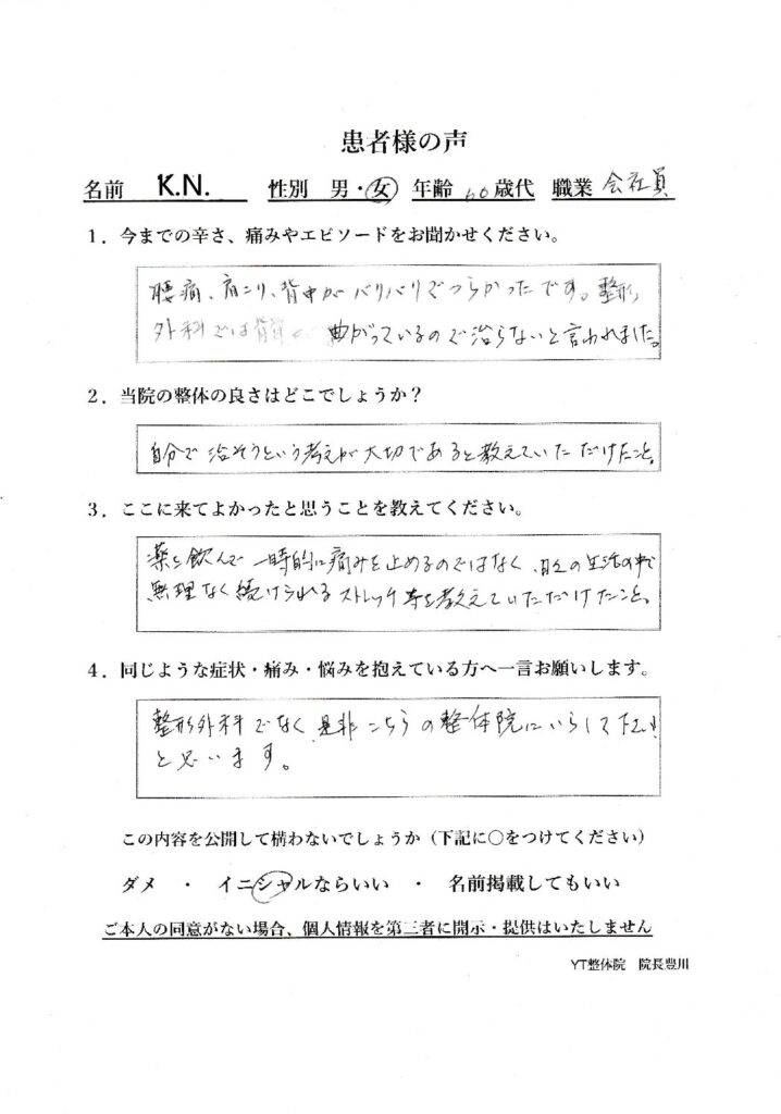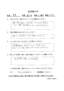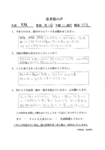 薬を飲んで一時的に痛みを止めるのではなく、日々の生活の中で、無理なく続けられるストレッチ等を教えていただけたこと。