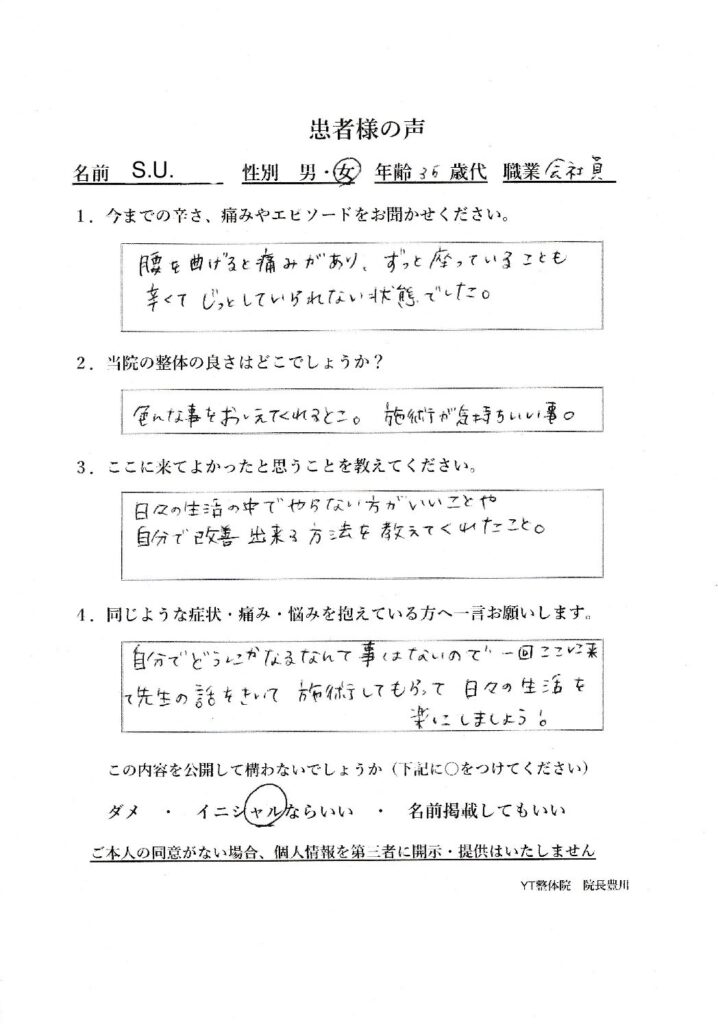 腰を曲げると痛みがあり、ずっと座っていることも辛くて、じっとしていられない状態でした。